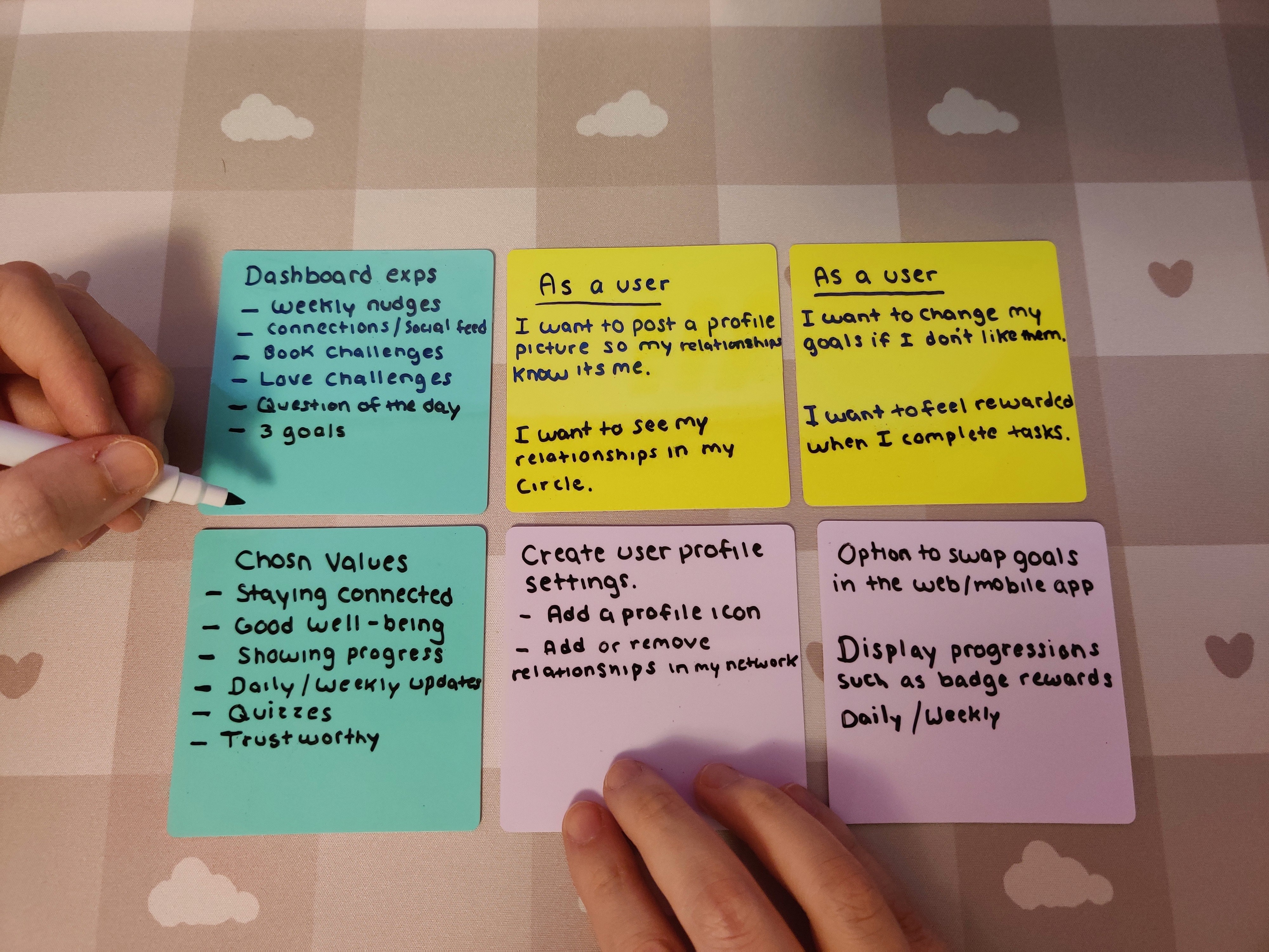 As a team, we selected the areas to focus on, and I chose the user profile screens. I brainstormed visual ideas and created sketches for key features, including adding a profile photo, editing relationships, viewing achievements, and editing goals.