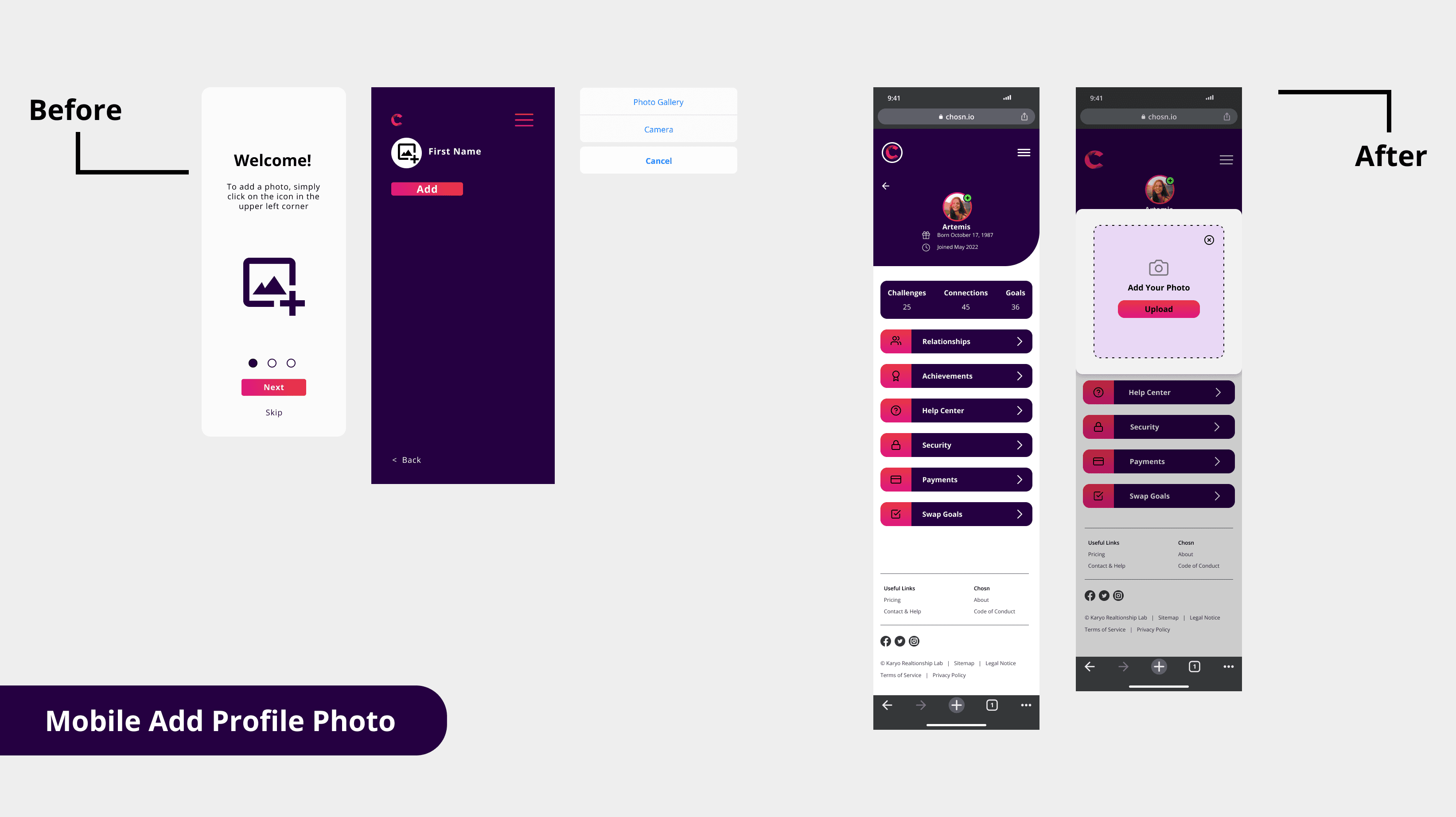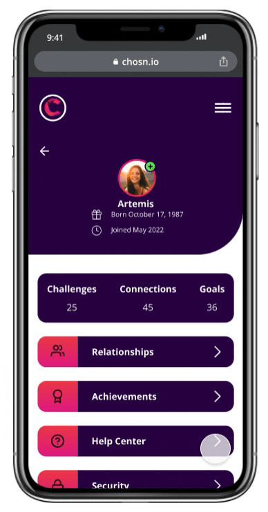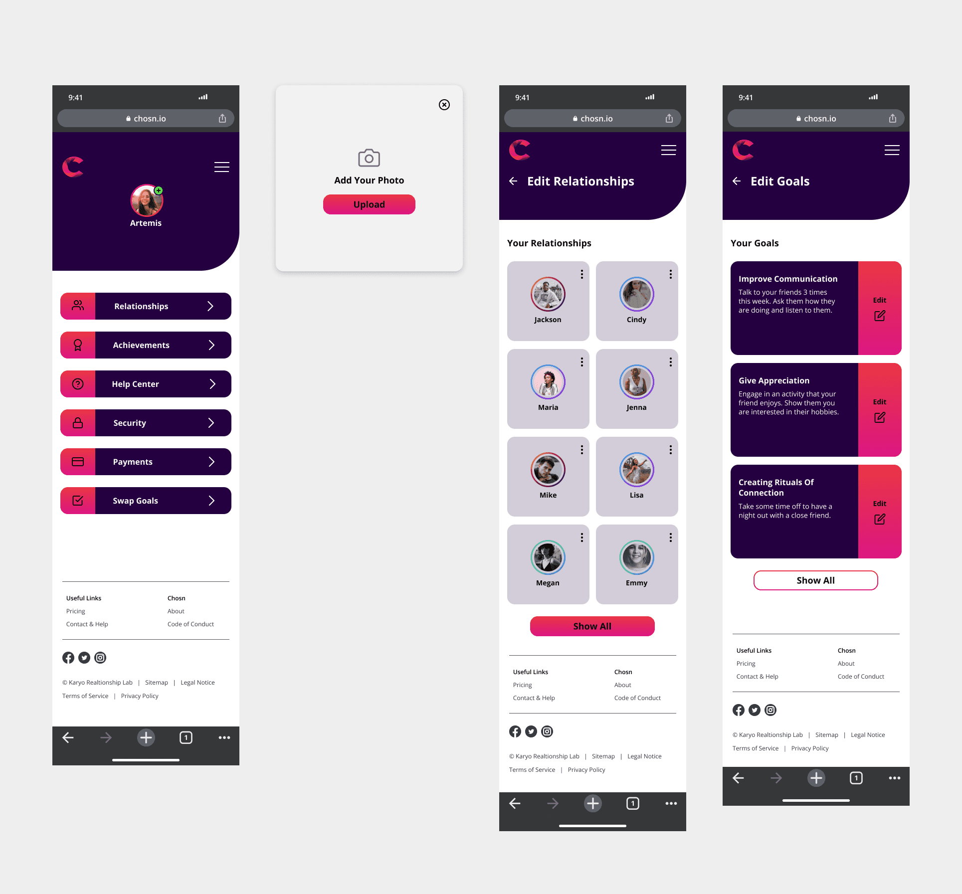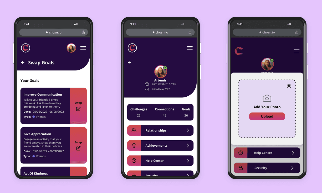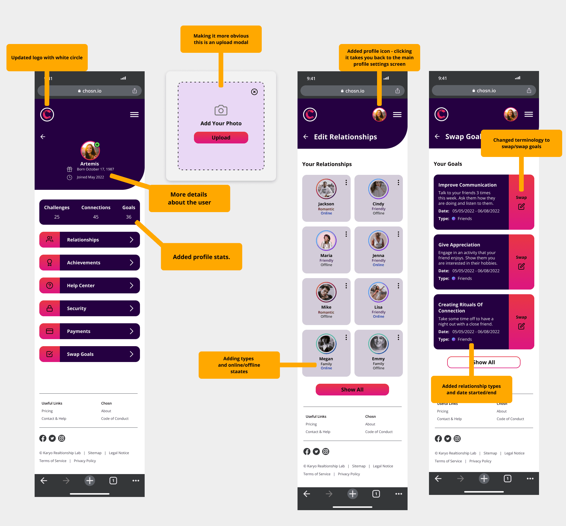 After receiving client approvals we decided it was time to redesign the rest of the screens. I wanted to make the Chosn color palette work with these designs, our focus was to make it look simple and intuitive for the users. I focused on designing the user profile and goals screens. I wanted to give users a way to add profile pictures, edit their relationships, view their achievement rewards, and edit goals.