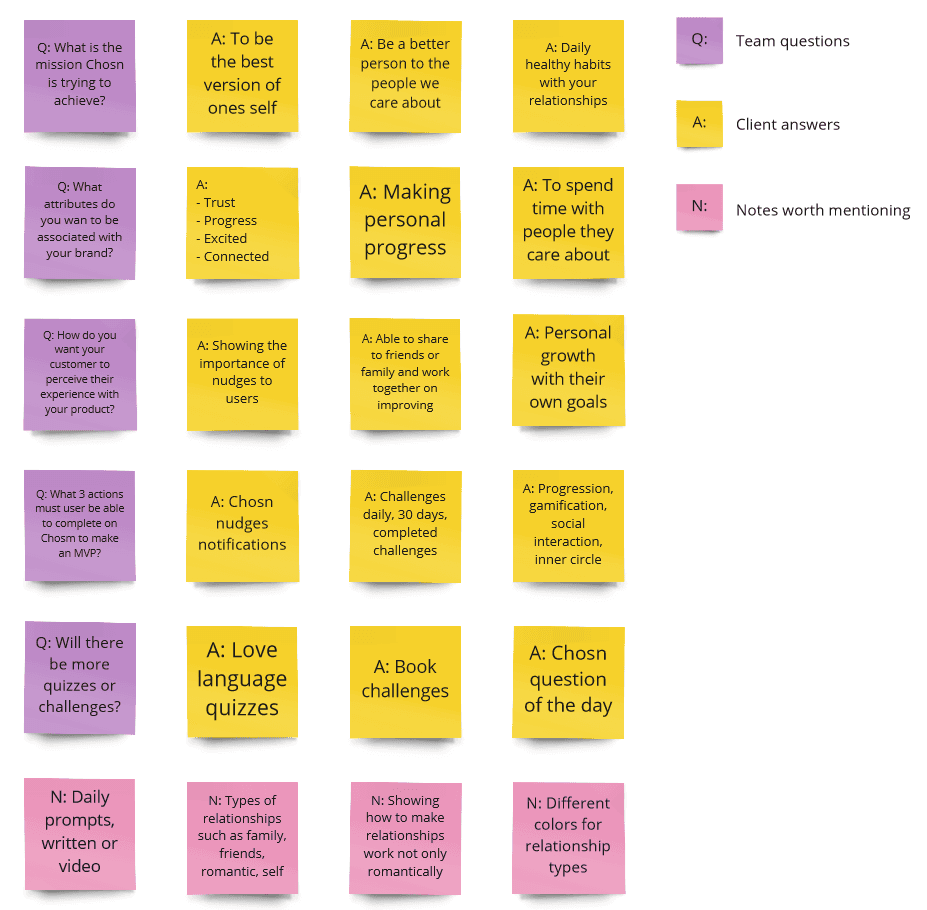 I wanted to understand the goals Chosn intends to do in order to be a successful product for users. I took a dry-erase marker and some sticky notes to take down a few critical points to try solving the problem for users who may face using Chosn. I created a few simple statements and observations I received based on our client meeting. The most relevant insights I captured are for the design of the dashboard and user profile ideas.
