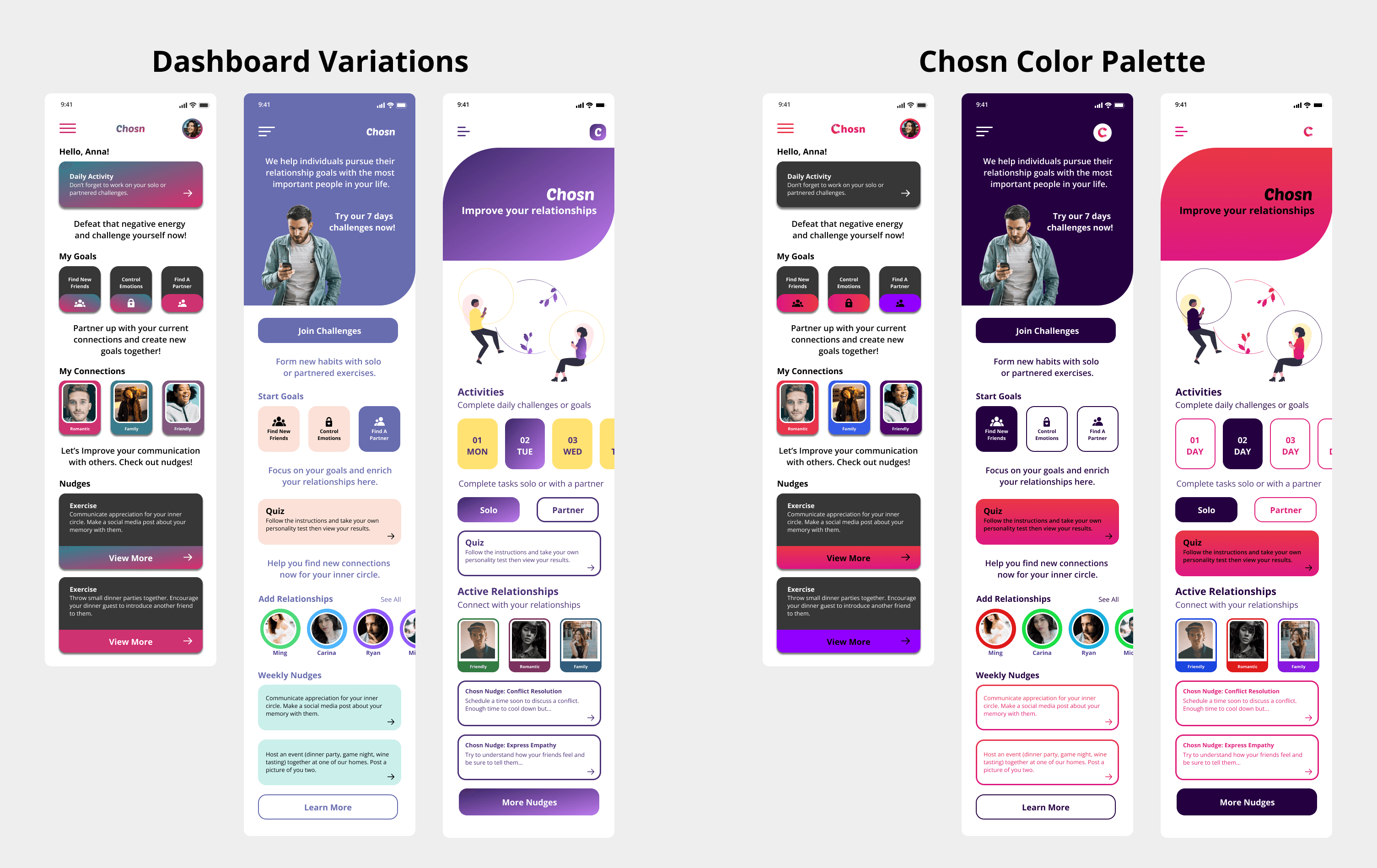 Our team came up with some creative ideas, and we each got to design our own version of the dashboard. Since the client wants a fresh, modern vibe, I whipped up a few variations featuring gradients and calming, mental health-inspired colors. For fun, I also threw in a version using Chosn's default color palette on the right side, just in case we stick with the original look.