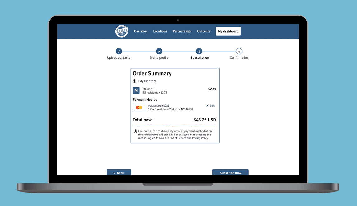 In response, I created a new design version that mirrors the current process, as the client seems more familiar with this approach. The updated design features a more polished look, incorporating imagery, additional buttons, and a gift message. We also added double back and next buttons to streamline navigation, eliminating the need for users to scroll excessively.