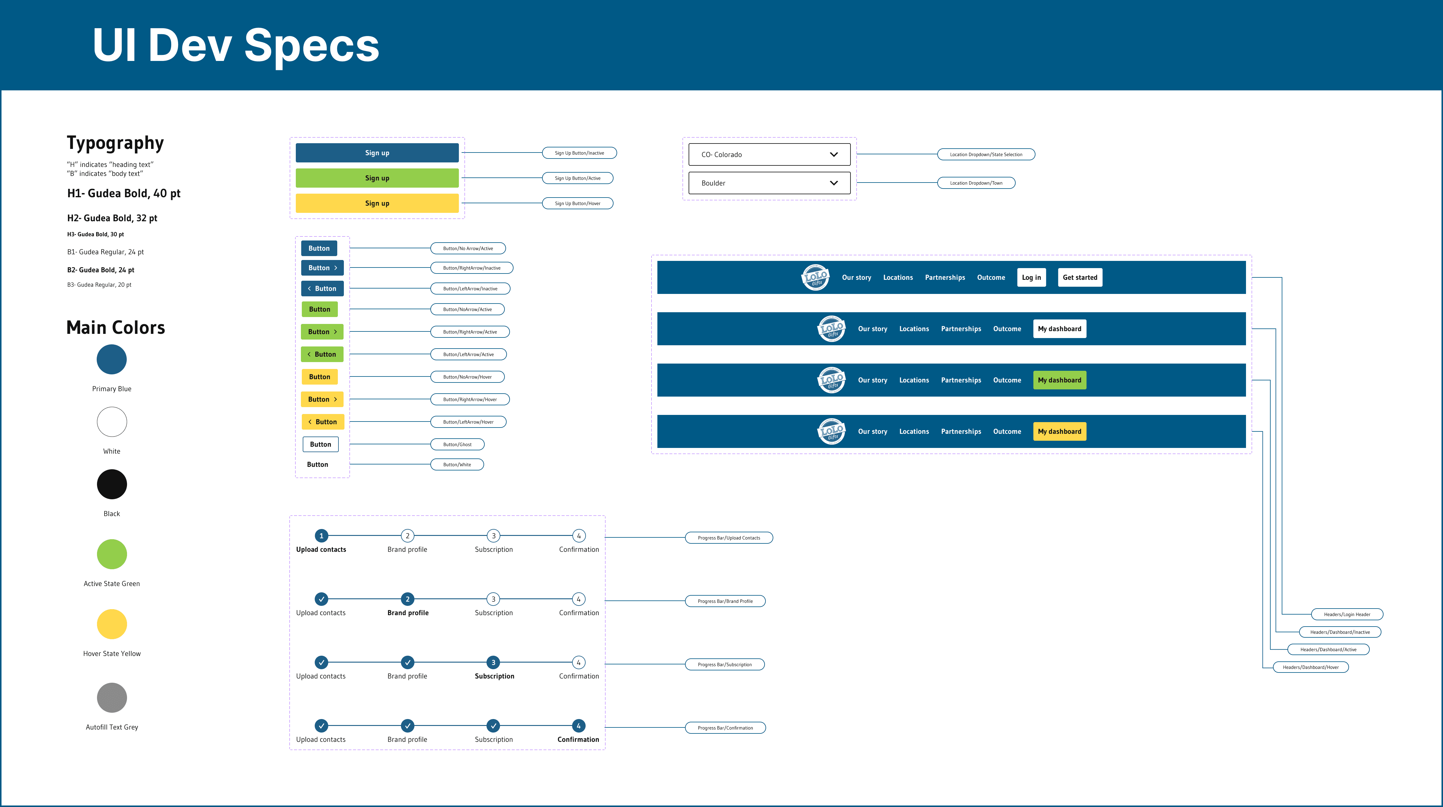 For the final deliverable, we provided a detailed handoff, annotating each screen in our user flows to guide developers through the functionality of every element. The UI specs include precise details on hover states, as well as the navigation and progress bar components, ensuring clarity and alignment during the development phase.