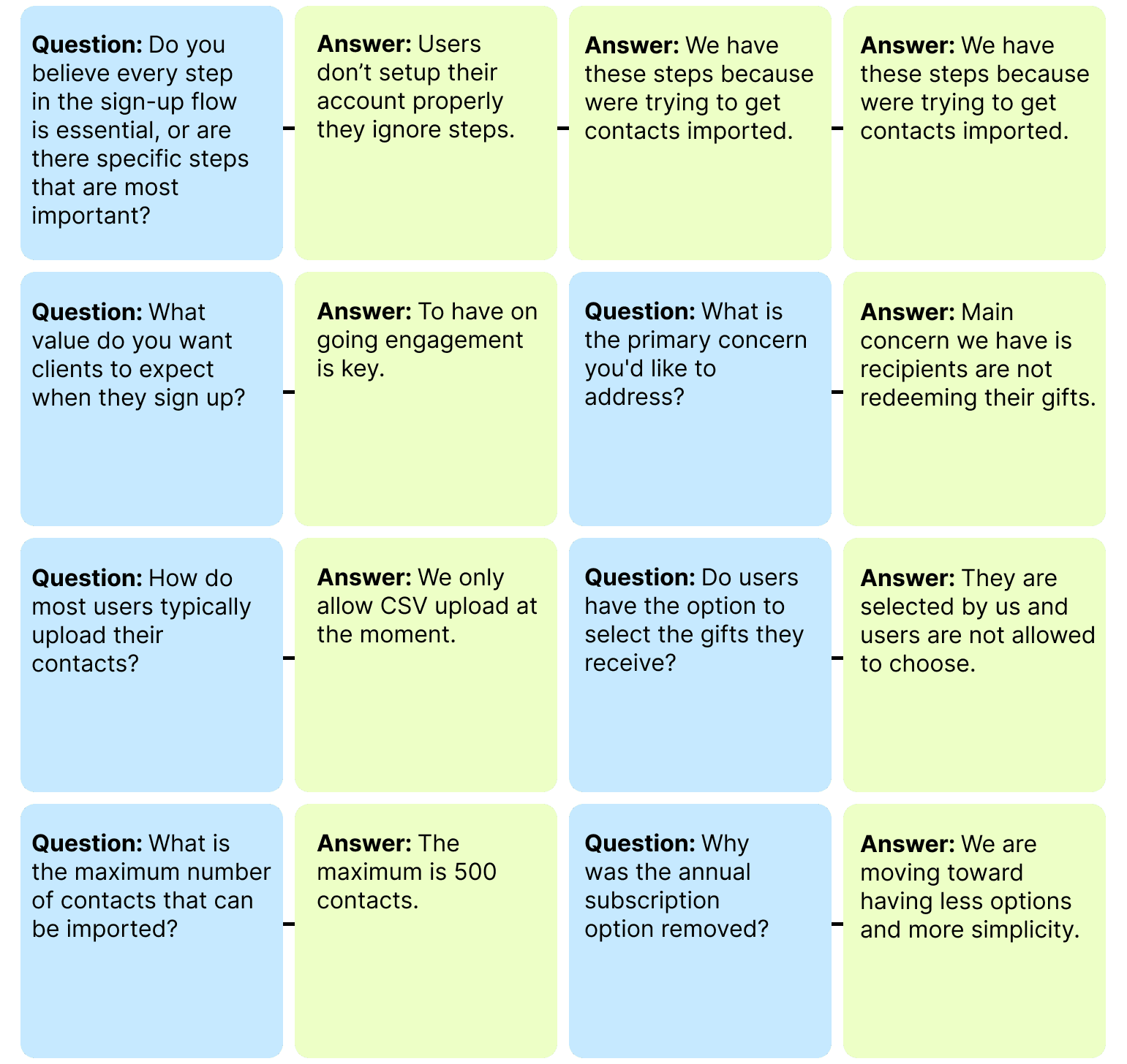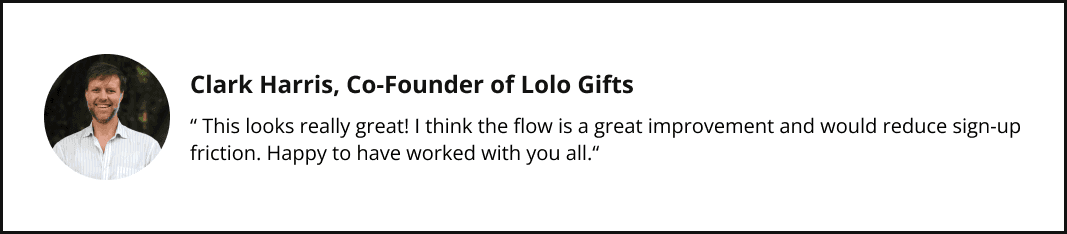 My team and I developed a set of targeted questions to better understand our client's needs and enhance the user experience for Lolo Gifts. During our discussions, the client highlighted their need for a smoother sign-up flow that clearly communicates the value of their services, helping users engage more effectively with their platform.