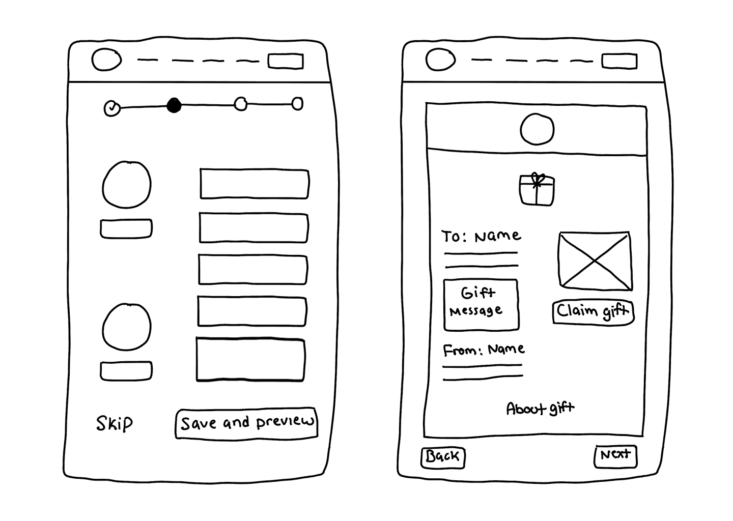 I've created a few sketches for the email preview screens because our client has observed that users frequently skip this step rather than engaging with it. It seems that the value of these screens isn't immediately clear to users. To address this, I propose simplifying the screen to highlight the most relevant information for the user. Below, I’ve included examples demonstrating how both the recipient and sender will view the gift details and the redemption process.