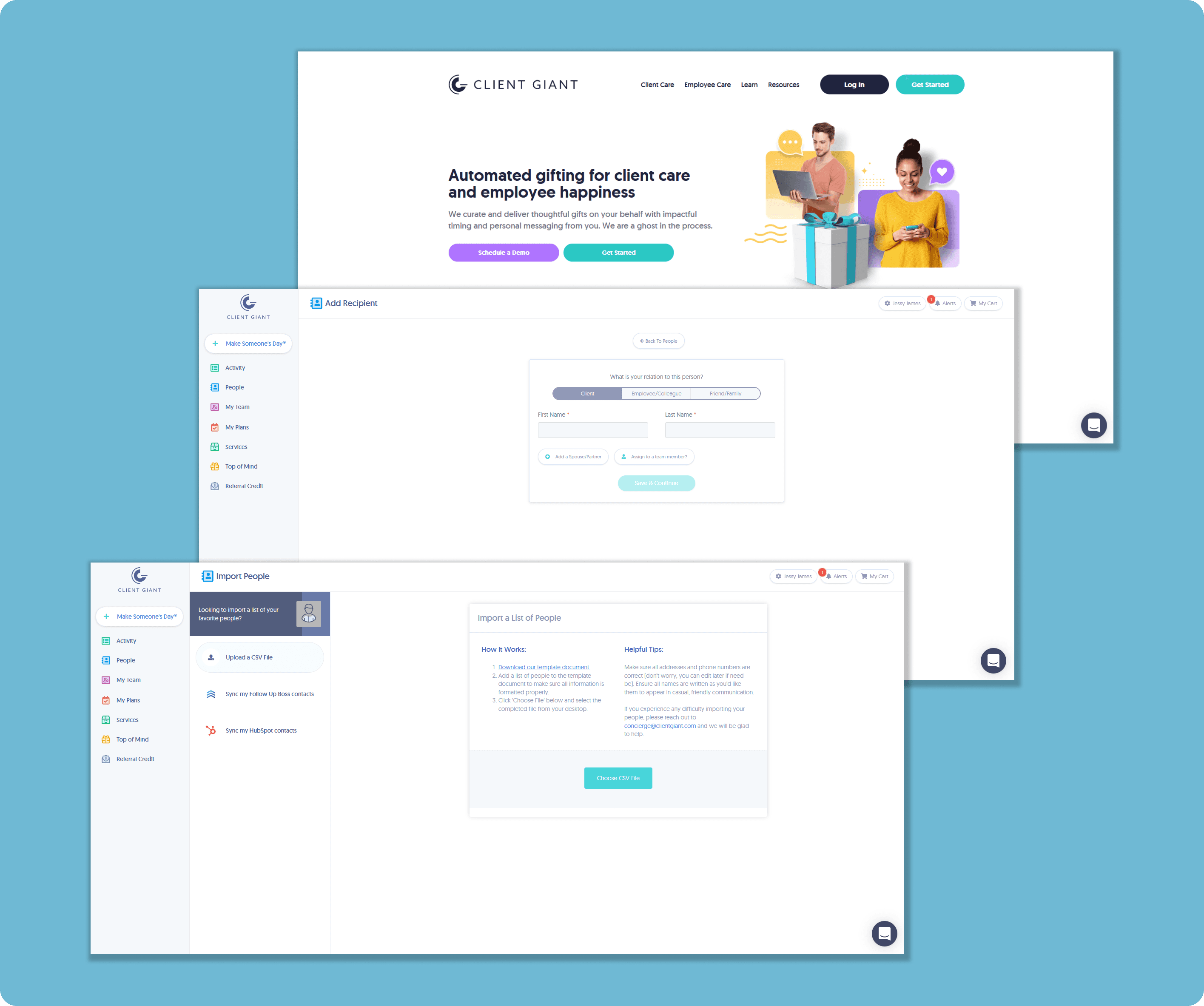 Client Giant is another online gifting subscription website for real state and local businesses. They have a simple minimalist design that's easy to navigate through. We took a look at their services and sign-flow process. This information will be helpful to understand the way a gifting engagement platform functions.