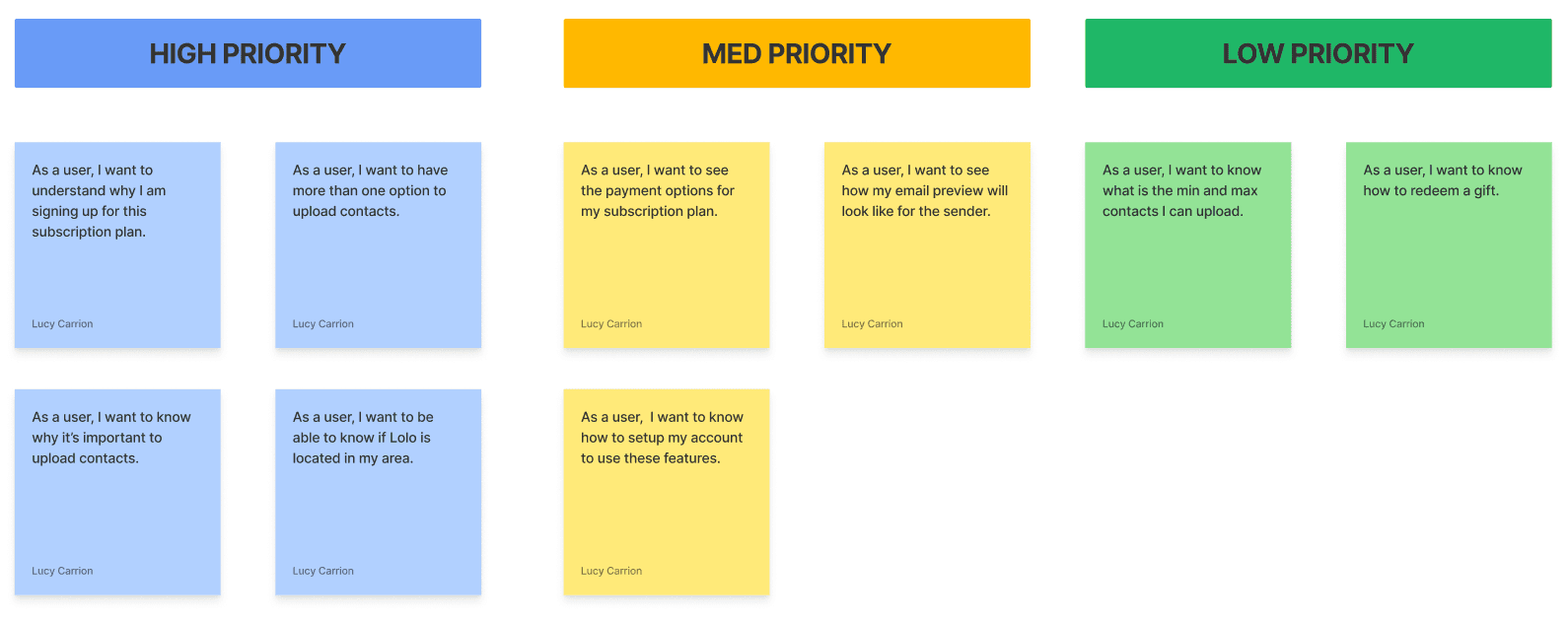 After looking over the research and competitive analysis, I wrote up some user stories to help us gather a few ideas about the features we would like to implement. I organized the user stories from high to low priorities.